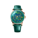 The Audemars Piguet Code 11.59 Grande Sonnerie “150th Anniversary” Ref. 26397OR.OO.D417CR.01 features a high-end artistic dress watch style, showcasing a 904L stainless steel case finished in a luxurious rose gold tone. It is perfectly combined with a high-quality emerald green leather strap, creating a distinct and noble feel. The highlight is the artistic dial with a multi-colored opal effect, appearing vivid like a miniature painting, making it suitable for gentlemen who love refined beauty, uniqueness, and high personal aesthetic taste.