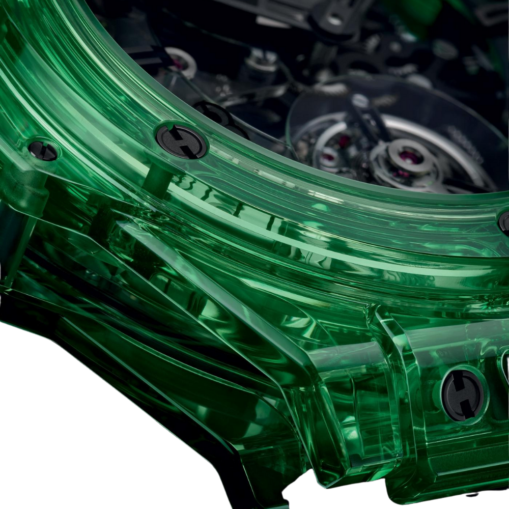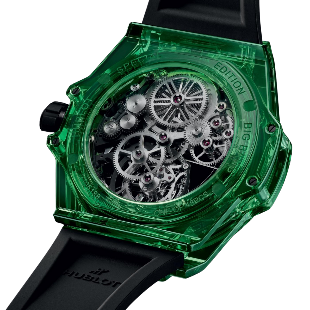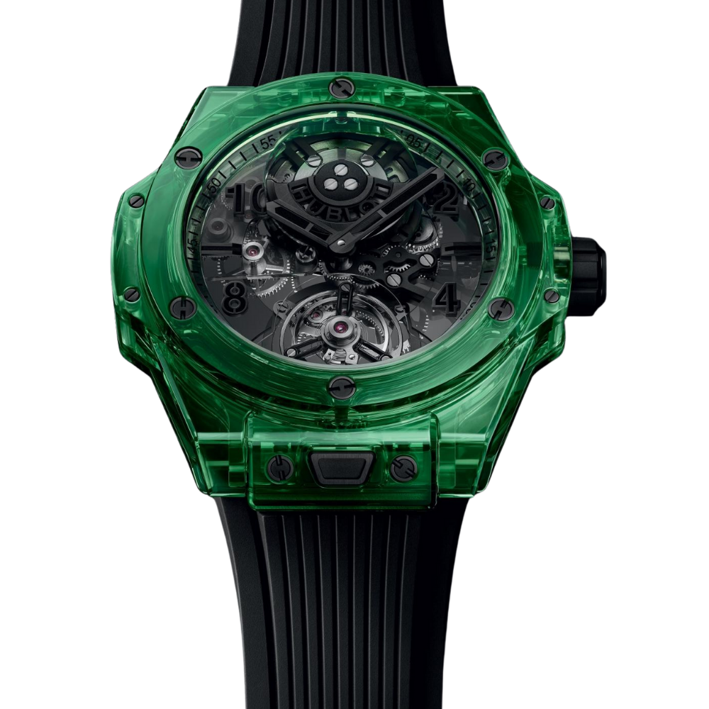 Bold, futuristic, and mechanically expressive, the Big Bang Tourbillon Green Saxem delivers a