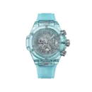 The Hublot Big Bang Unico Water Blue Sapphire Ref. 421.JL.4890.RT embodies a high-end futuristic sporty style. Distinguished by its strong open-worked skeleton design combined with a transparent water blue sapphire case, it creates a unique visual effect. Paired with a synchronized transparent rubber strap, this timepiece offers a modern, youthful feel while maintaining the brand’s technical identity, suitable for those who love distinctiveness, technology, and a pioneering spirit.