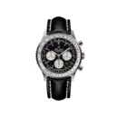 This model showcases a professional and classic aesthetic. The strap is made of high-quality black leather with a smooth surface and contrasting stitching, secured by a metal pin buckle. The bezel features the rotating slide rule characteristic of the Navitimer, engraved with aviation calculation scales. The black dial features a balanced chronograph layout, while luminous hands and markers ensure visibility, emphasizing a look that is technically precise and aesthetically commanding.