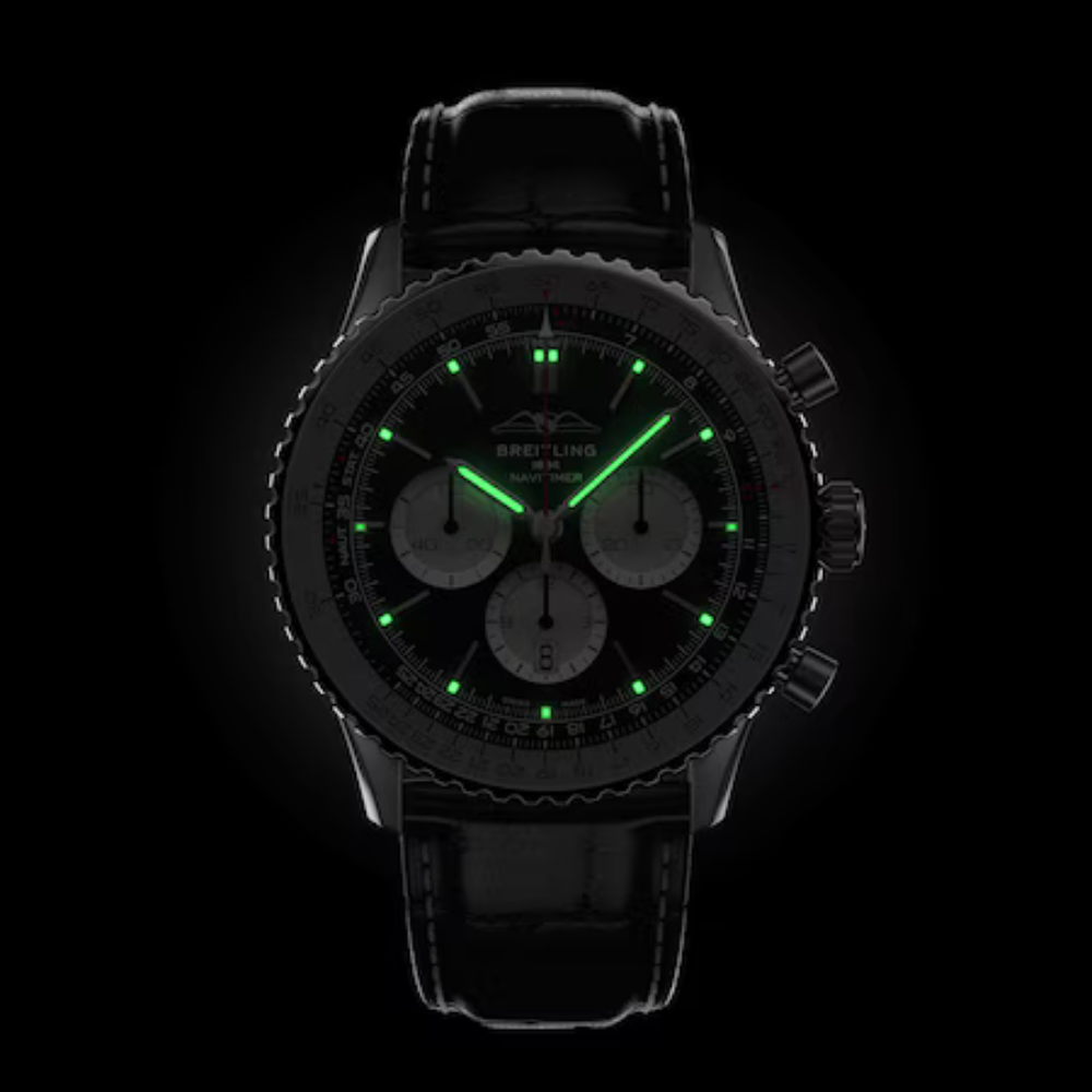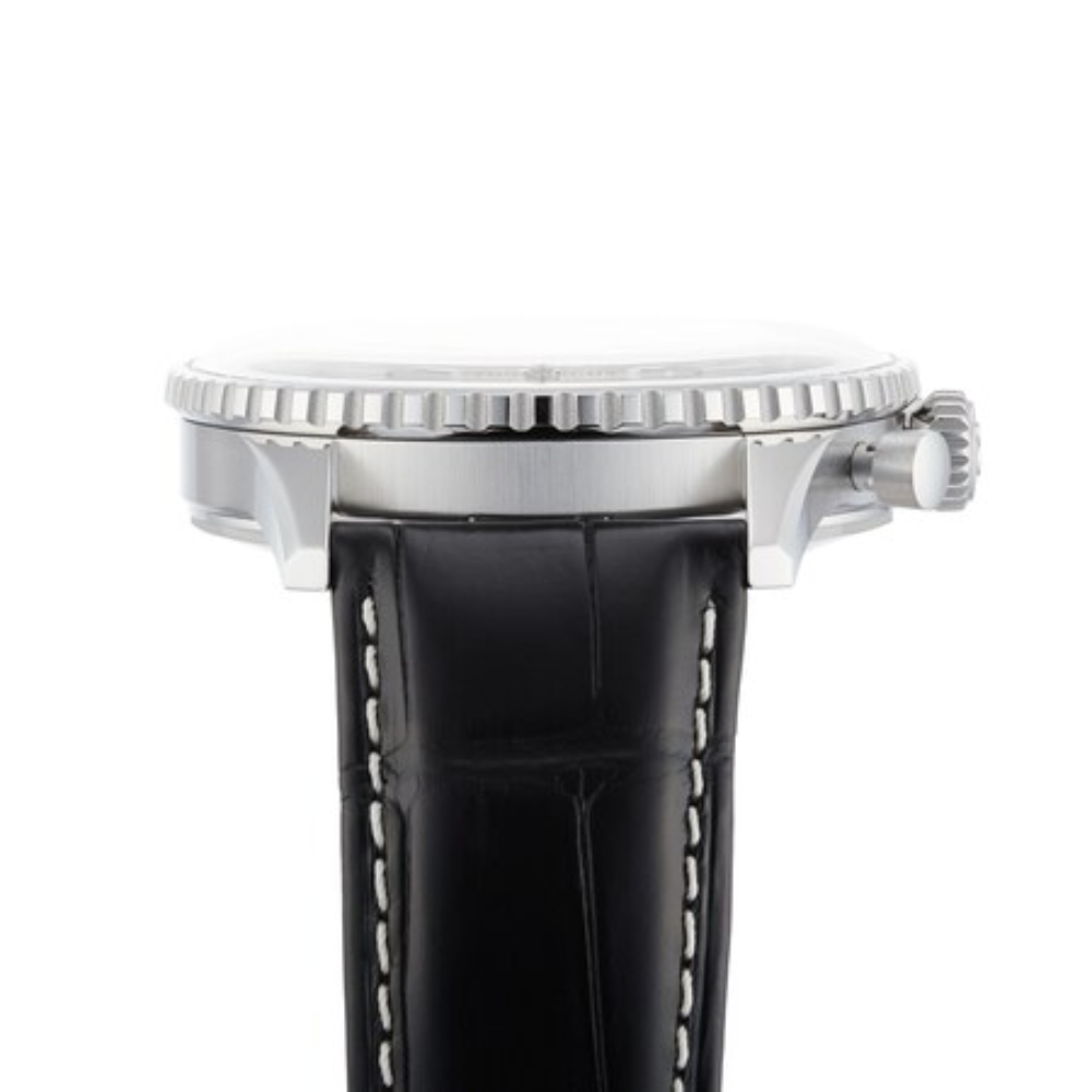 This model showcases a professional and classic aesthetic. The strap is made of high-quality black leather with a smooth surface and contrasting stitching, secured by a metal pin buckle. The bezel features the rotating slide rule characteristic of the Navitimer, engraved with aviation calculation scales. The black dial features a balanced chronograph layout, while luminous hands and markers ensure visibility, emphasizing a look that is technically precise and aesthetically commanding.