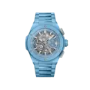 Belonging to the Big Bang Integrated line—an important stride in the Big Bang history since the revolution in 2005 when Hublot defined the Art of Fusion philosophy—this Sky Blue Ceramic Ref. 451.EX.5120.EX continues that spirit. With a seamless metal structure and a modern color palette, it emphasizes mechanical elements through the skeleton dial and chronograph performance. This watch is not just a precise timekeeper but represents a historical period where the high-end sports watch became a manifesto of technology, creativity, and a modern lifestyle.