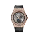 The Hublot Classic Fusion Aerofusion Moonphase King Gold 42mm, Ref# 547.OX.0180.LR showcases a high-class luxury style that blends modern spirit with classic touches. It features a 904L stainless steel case in a warm rose gold tone, adorned with sparkling synthetic stones on the bezel, paired with a premium black leather strap. The skeleton dial, combined with a moonphase calendar, creates an artistic depth and elegance, making it perfect for those who appreciate sophistication, luxury, and distinct aesthetic taste.