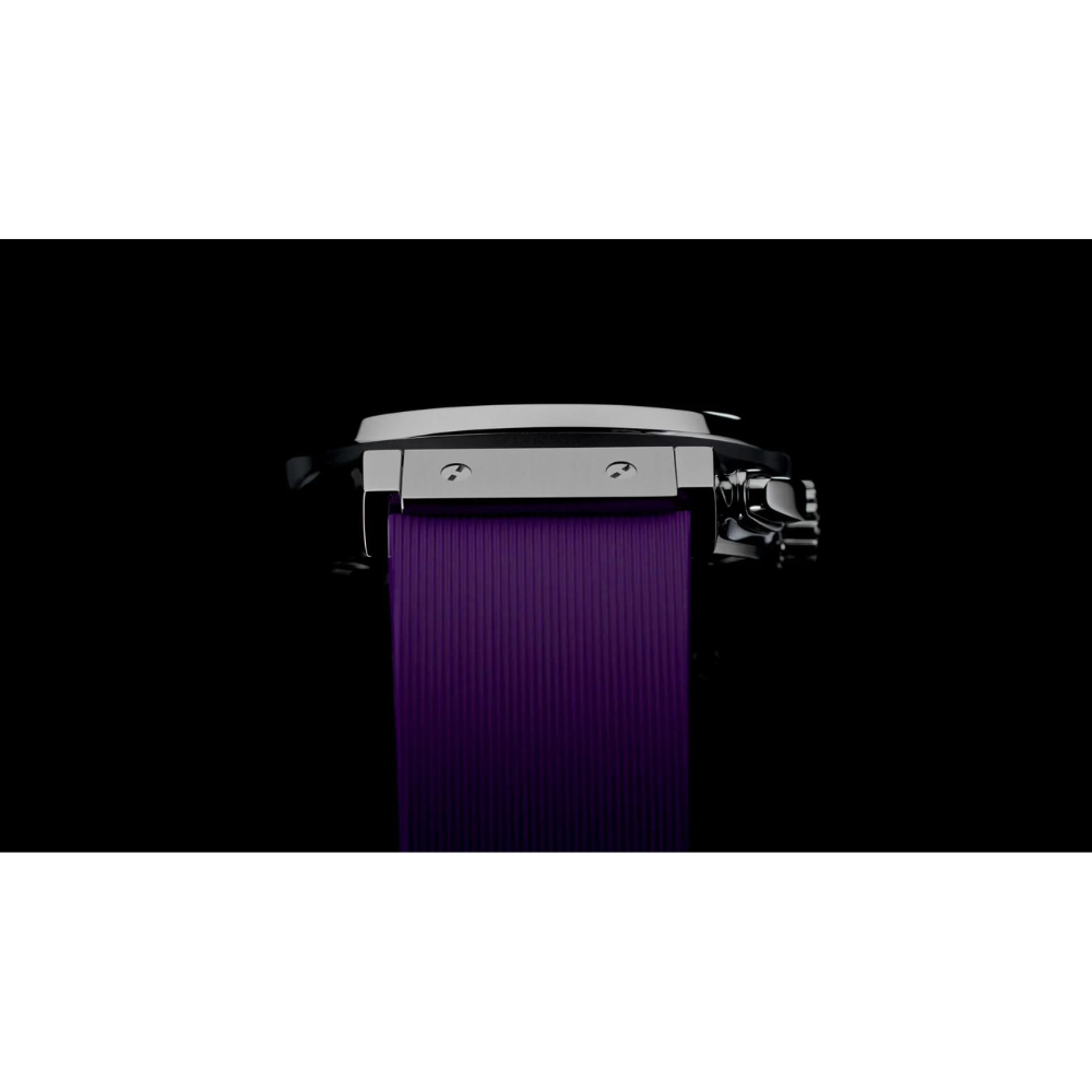 This model showcases a youthful and sophisticated aesthetic. The high-quality purple rubber strap adds a distinctive touch and ensures comfortable wear. The fixed bezel, crafted from 904L stainless steel in a sporty design with signature exposed screws, frames the dial elegantly. The purple dial features a balanced chronograph layout with prominent sub-dials, while luminous baton hands and hour markers ensure excellent readability and a polished look.