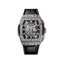 The Hublot Spirit of Big Bang Titanium 45mm Ref. 601.NX.0173.LR showcases a powerful, high-end sporty style with its signature tonneau case shape. It features a sharp 904L stainless steel case combined with a high-quality black leather strap, creating a masculine, modern, yet luxurious appearance. The skeleton chronograph dial with red accents provides visual depth and a dynamic sensation, making it perfect for those who appreciate distinct aesthetics and strong technical character.
