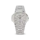 This Nautilus exudes iconic sports elegance with a refined, masculine presence. The polished 904L stainless steel case and integrated bracelet offer a seamless, architectural profile, while the discreet use of synthetic stones adds a sophisticated shimmer without overpowering the design. The silver-toned dial with its signature horizontal texture, paired with luminous baton hands and markers, ensures clarity and balance, expressing the Nautilus philosophy of quiet luxury and confident refinement.