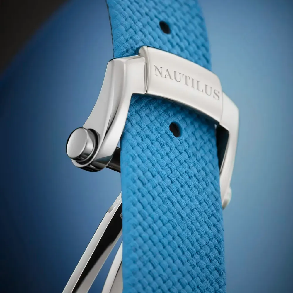 Inspired by the maritime spirit and the luxury sports watch designs that emerged in the 1970s, this Nautilus model carries forward the collection’s signature elements—such as the softly rounded case and the iconic horizontal dial pattern. The design is refreshed with a modern blue canvas strap and a finely executed synthetic-stone-set bezel, creating a seamless dialogue between haute horology heritage and contemporary lifestyle. The result is a watch that celebrates freedom, elegance, and enduring craftsmanship.