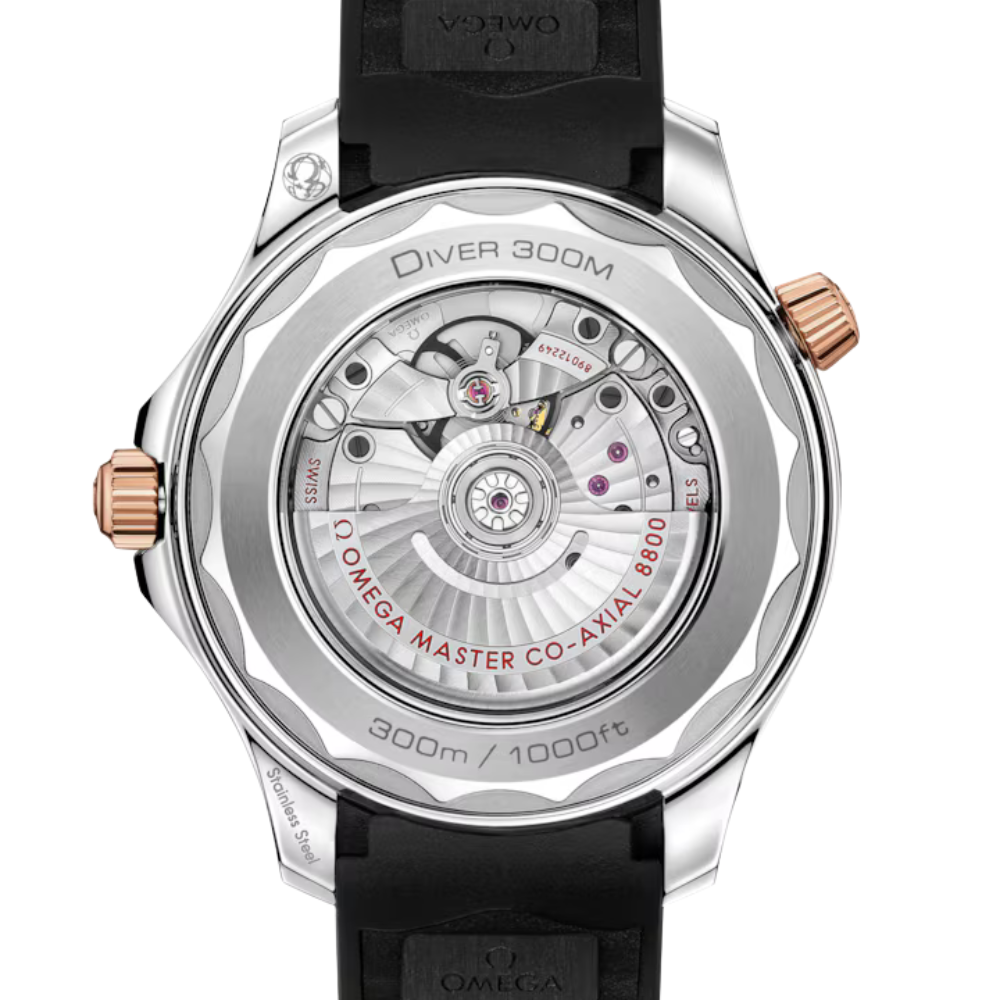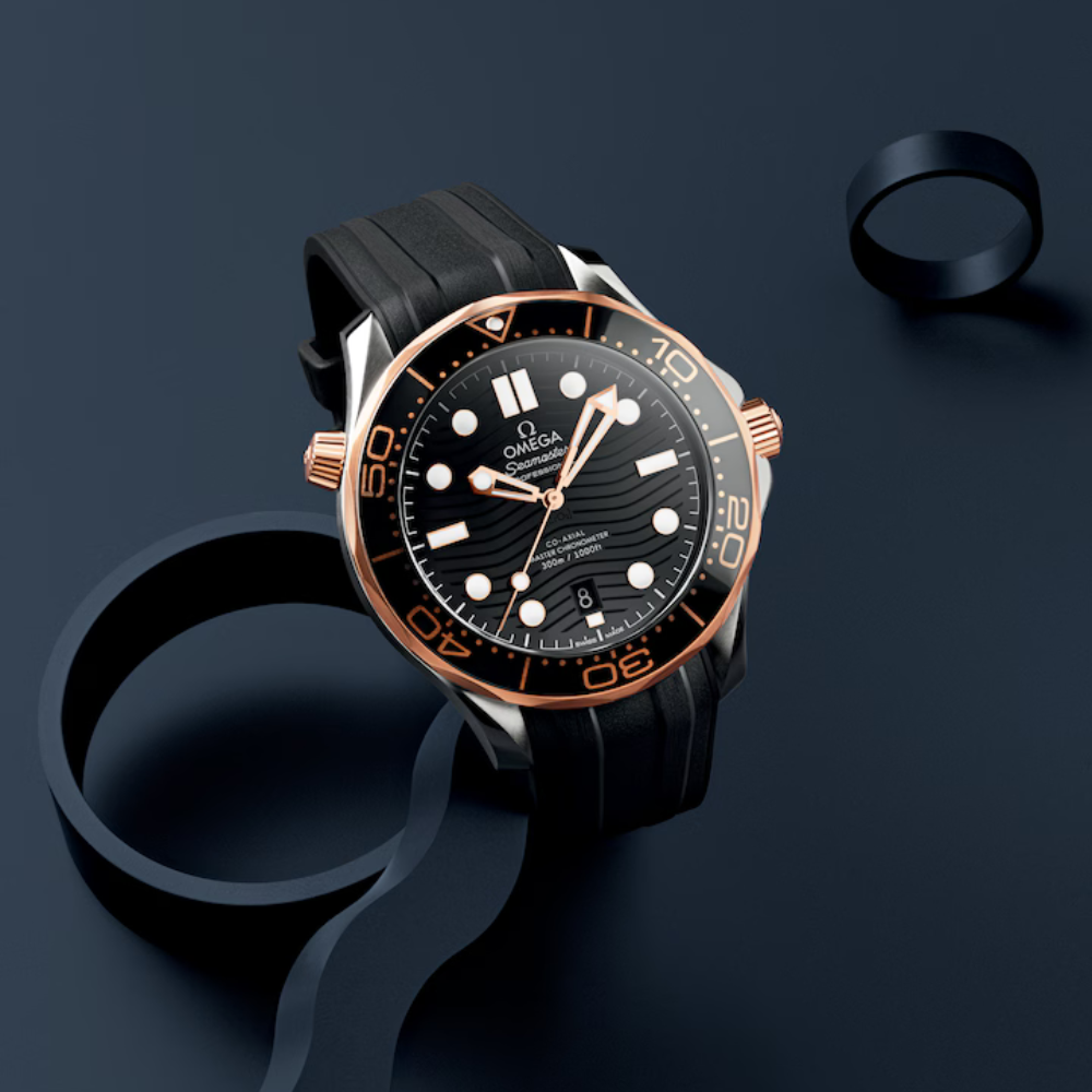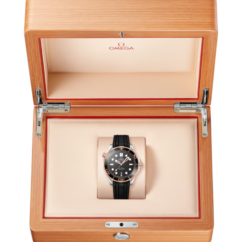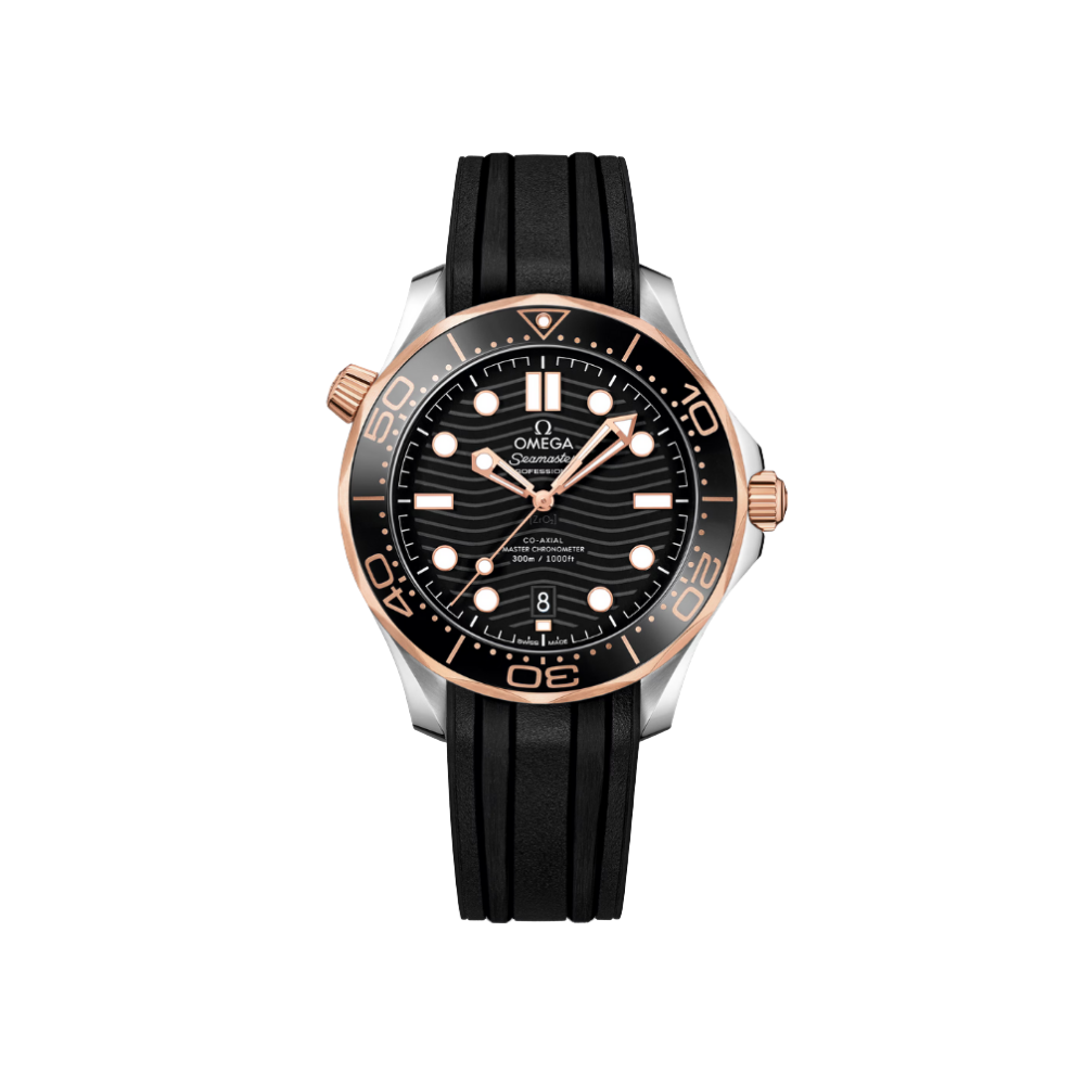 The Omega Seamaster Diver 300M Ref. 210.22.42.20.01.002 is a modern luxury dive watch inspired by the legendary maritime heritage of the Seamaster line. Featuring a 42mm case crafted from 904L stainless steel, a signature wave-pattern black dial, and a unidirectional diver bezel accented in black and rose-gold tones, this model delivers a refined balance between professional dive functionality and contemporary elegance.