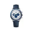 The Omega Speedmaster 50th Anniversary #310.32.42.50.02.001 features a classic sporty chronograph style blended with modern flair. It stands out with a distinctive white dial coordinated with blue accents marking the anniversary, combined with a youthful blue technical fabric strap. This model exudes a refined and elegant feel, suitable for both daily use and special occasions, reflecting the dynamic, precise, and iconic spirit of the Speedmaster.