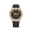 The Patek Philippe Annual Calendar Moonphase 5205R-001 features a deeply classic and elegant style typical of a dress watch. It combines a 904L stainless steel case finished in a sophisticated rose gold tone with a high-quality black leather strap, creating a warm and luxurious appearance. The black dial, accented with rose gold rims and a balanced layout of annual calendar and moonphase functions, offers a look that is meticulous and visually deep, suitable for gentlemen who love a calm, refined, and sustainable style.