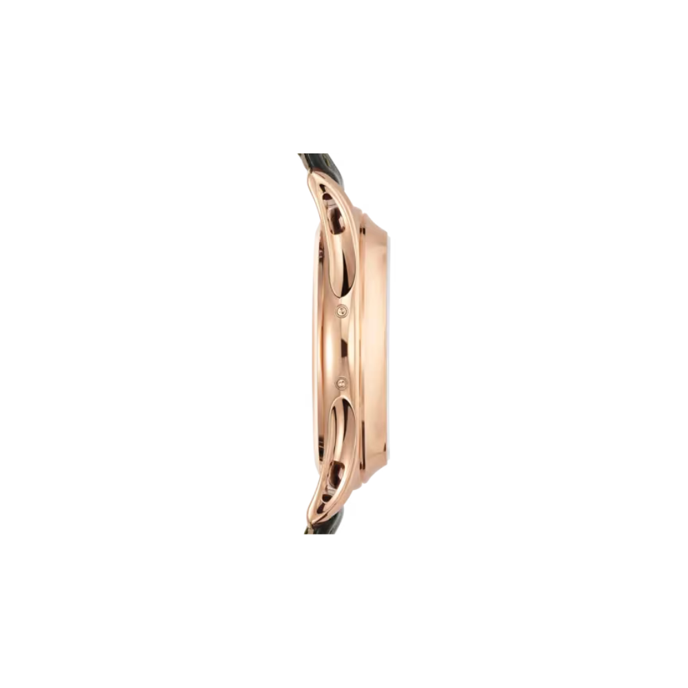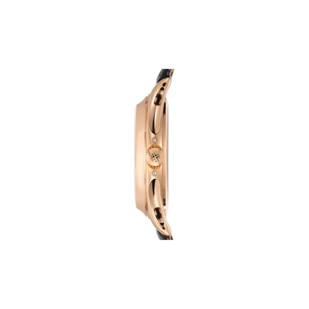The Patek Philippe Annual Calendar Moonphase 5205R-001 features a deeply classic and elegant style typical of a dress watch. It combines a 904L stainless steel case finished in a sophisticated rose gold tone with a high-quality black leather strap, creating a warm and luxurious appearance. The black dial, accented with rose gold rims and a balanced layout of annual calendar and moonphase functions, offers a look that is meticulous and visually deep, suitable for gentlemen who love a calm, refined, and sustainable style.