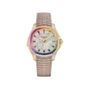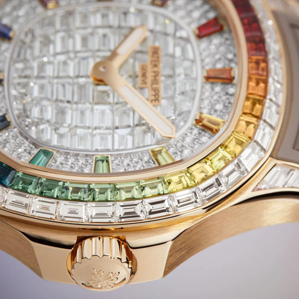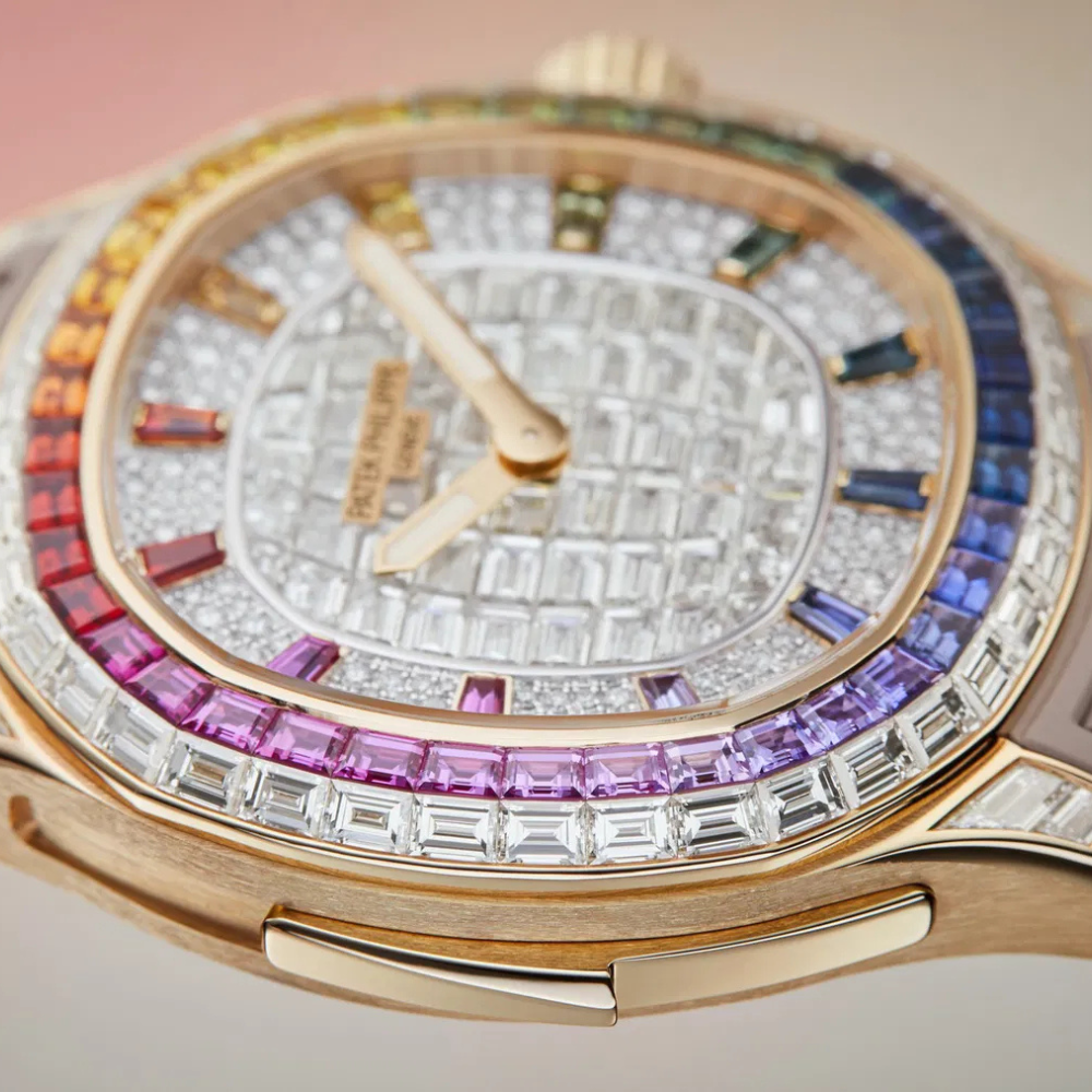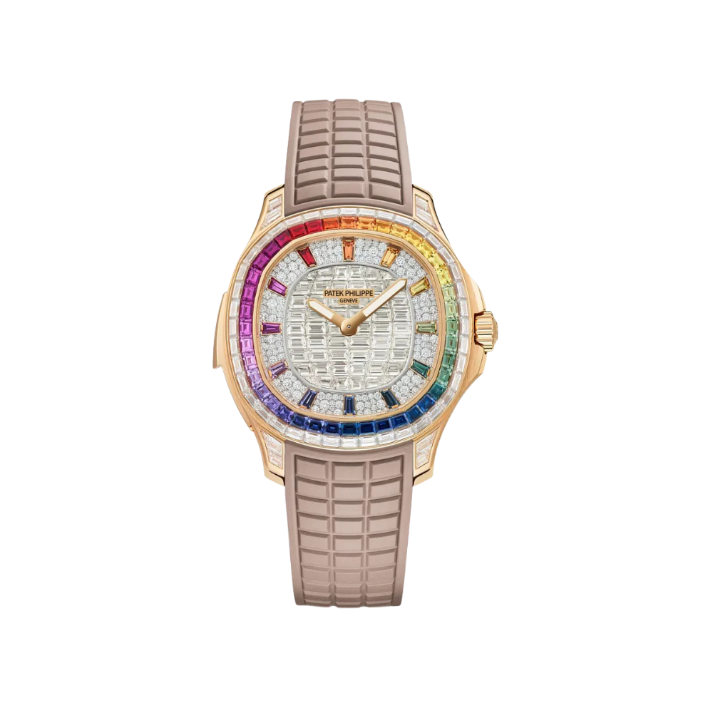 This Aquanaut embodies modern luxury with a vibrant, fashion-forward character. The warm rose-gold-toned accents pair beautifully with the elegant taupe rubber strap, offering comfort and sophistication in equal measure. The fully synthetic-stone-set dial provides a luminous focal point, while the rainbow-cut synthetic stone bezel creates a striking visual statement. The overall design feels confident, contemporary, and perfectly balanced—ideal for those who seek a distinctive yet refined presence on the wrist.