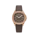 This model embodies sporty luxury with a touch of refined elegance characteristic of the Aquanaut line. The warm rose-gold tone paired with a premium brown rubber strap delivers a modern, comfortable, and wearable aesthetic. The taupe-brown vertically textured dial and raised Arabic numerals add classic sophistication, while the evenly set synthetic-stone bezel provides a subtle yet striking highlight—resulting in a balanced, tasteful statement suitable for both daily wear and elevated occasions.