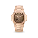 The Patek Philippe Nautilus 5712/1A-001 – Stainless Steel Moon Phase embodies a characteristic luxurious sporty style, featuring the soft rounded design of the Nautilus line. It stands out with a warm chocolate brown dial combined with a solid integrated metal bracelet, creating a sophisticated and masculine feel. Highlighting a moon phase indicator and asymmetrical sub-dials, this model is suitable for both daily wear and formal occasions where elegance and depth are required.