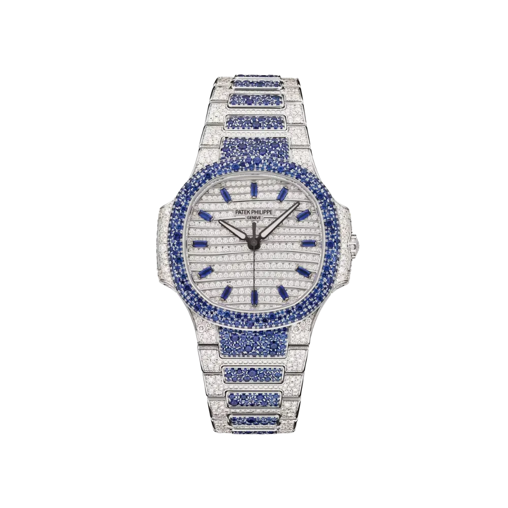 Inspired by the legendary Nautilus collection born in the 1970s—a pivotal era when stainless-steel sports watches first entered the world of luxury—this Ladies Haute Joaillerie edition elevates the original design to an artistic level. By enriching the sporty architecture with refined jewelry craftsmanship, fully pavé-set surfaces, and sapphire-blue synthetic stones, the watch becomes a timeless statement. It reflects the intersection of heritage, decorative artistry, and contemporary lifestyle, created for confident, independent women who value distinction and self-expression.