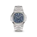 The Patek Philippe Nautilus Grand Complication Perpetual Calendar Watch – 5740/1G-001 represents the pinnacle of high-end sporty style, featuring a robust 904L stainless steel case and bracelet finished with refined brushing and polishing. It creates a seamless and solid feel, highlighted by the signature octagonal bezel and a blue horizontally brushed dial that creates visual depth. With a complex multi-subdial layout displaying technical prowess while remaining easy to read, this model is suitable for gentlemen who appreciate sophistication, strength, and discreet class.