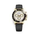 The Rolex Cosmograph Daytona Ref. M116518LN-0041 features a stunning combination of yellow gold and black details. The white dial is accented by black sub-dials, creating a perfect balance of sporty appeal and luxurious elegance. The tachymeter bezel further enhances the model’s functionality, while the Oysterflex bracelet ensures comfort and durability.