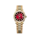 This captivating version features a red ombré dial adorned with synthetic stones, paired with the iconic President bracelet