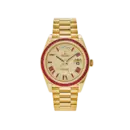 This Day-Date exudes commanding luxury. The radiant yellow gold tone paired with the vivid red