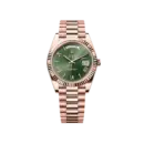 This model exhibits the distinctive Day-Date elegance, featuring a President bracelet made from 904L steel. The watch stands out with its fresh green dial, a perfect choice for those who love a classic style that remains powerful and sophisticated. The design seamlessly blends the warmth of the Everose gold tone with the vibrant dial, creating a unique statement piece.