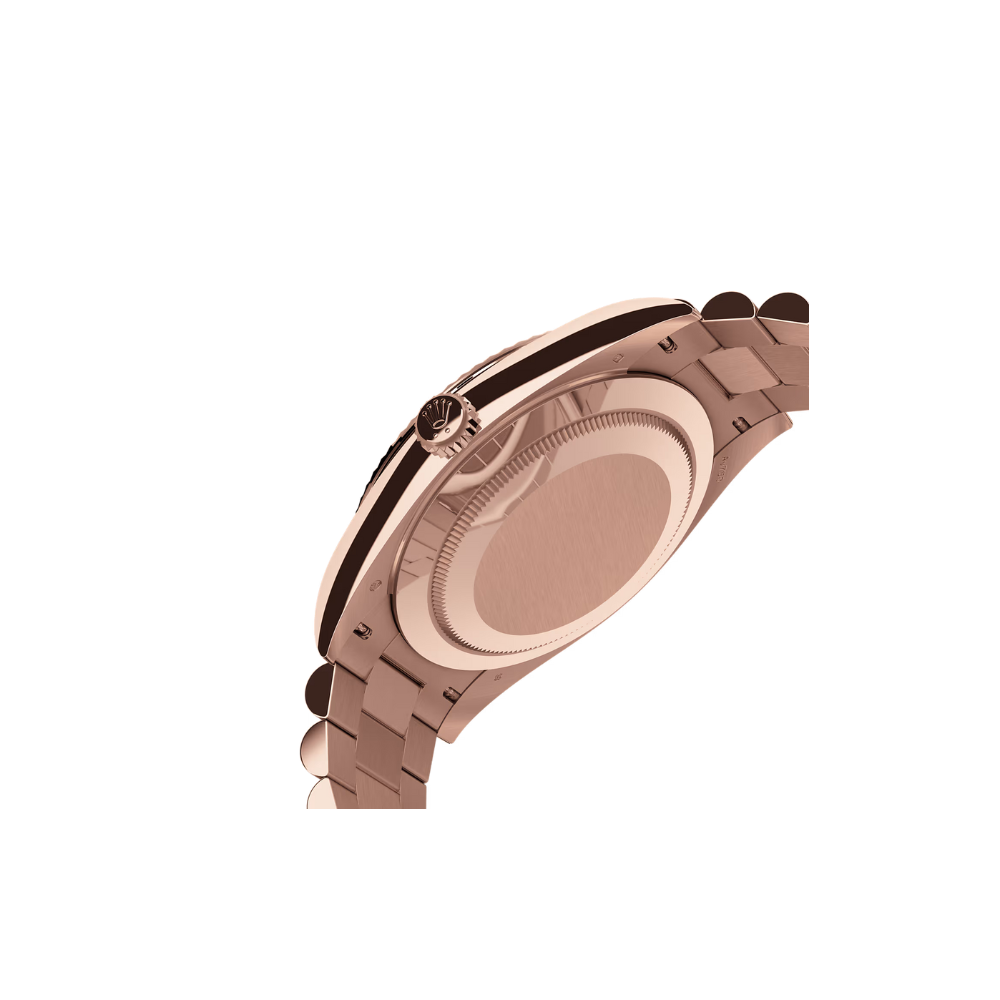 This model exhibits the distinctive Day-Date elegance, featuring a President bracelet made from 904L steel. The watch stands out with its fresh green dial, a perfect choice for those who love a classic style that remains powerful and sophisticated. The design seamlessly blends the warmth of the Everose gold tone with the vibrant dial, creating a unique statement piece.