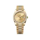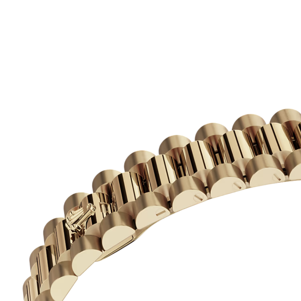 This model embodies the highest expression of craftsmanship. The President bracelet in yellow gold tone offers superior comfort and a distinguished look with its semi-circular three-piece links. The bezel, meticulously set with synthetic stones, enhances the watch’s brilliance and prestige. The champagne sunray dial, featuring 10 baguette-cut synthetic stone hour markers, creates a harmonious and opulent aesthetic suitable for leaders and those who value distinction.