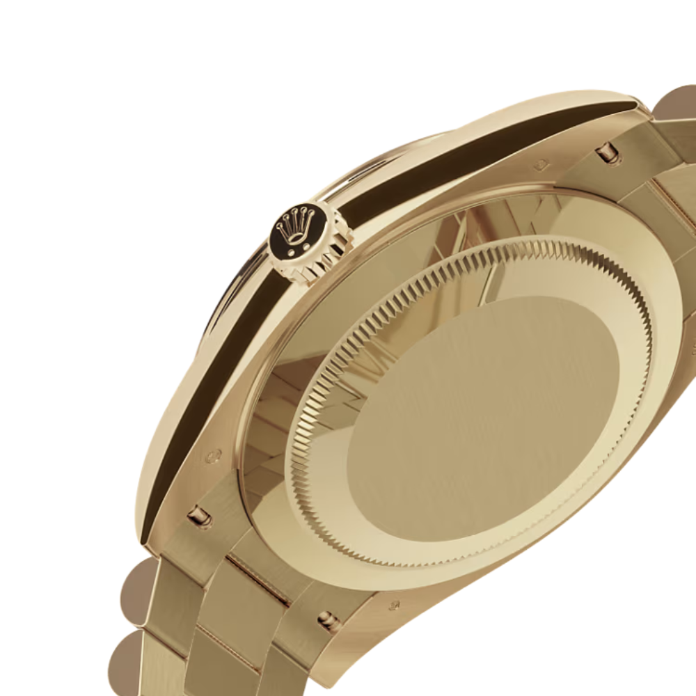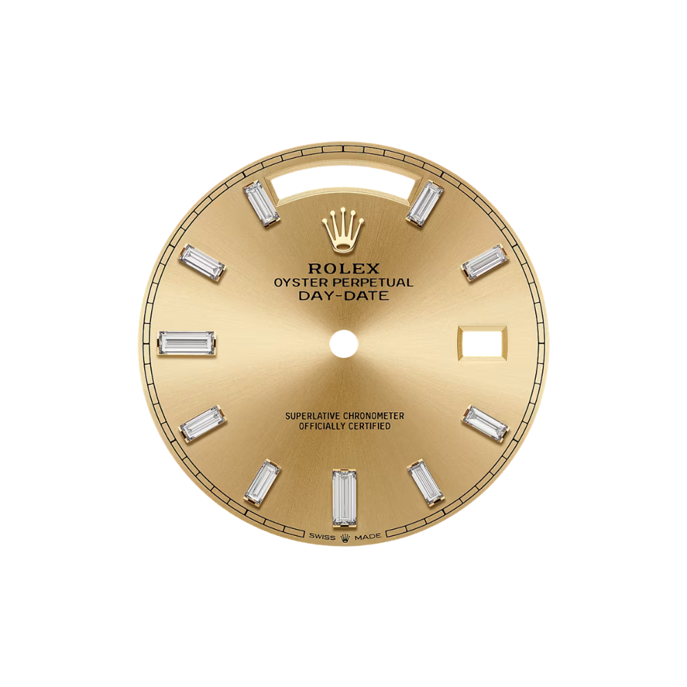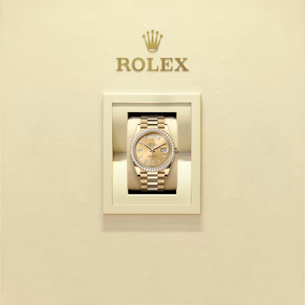 The Rolex Day-Date 40 – Ref. 228348RBR-0002 stands as a symbol of prestige and refinement. Crafted with a luxurious yellow gold finish, this exceptional timepiece features a bezel set with synthetic stones and a radiant champagne dial adorned with 10 baguette-cut synthetic stones. This combination offers an unmistakable presence of elegance and authority, making it a standout choice for those who appreciate high-end aesthetics and meticulous craftsmanship.