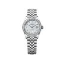This model showcases delicate elegance and classic femininity. The Jubilee bracelet made of 904L steel offers a soft and comfortable experience. The round bezel set with synthetic stones creates a sophisticated highlight. The silver dial is adorned with synthetic stone markers that catch the light beautifully, making it appropriate for both everyday wear and formal occasions.