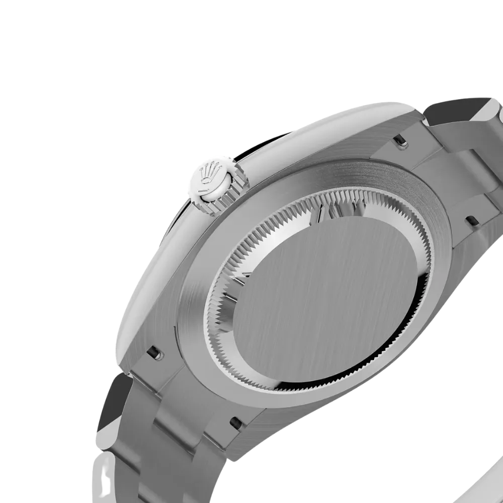 housed in Oystersteel, paired with a smooth domed bezel and the iconic Oyster bracelet.