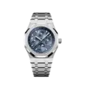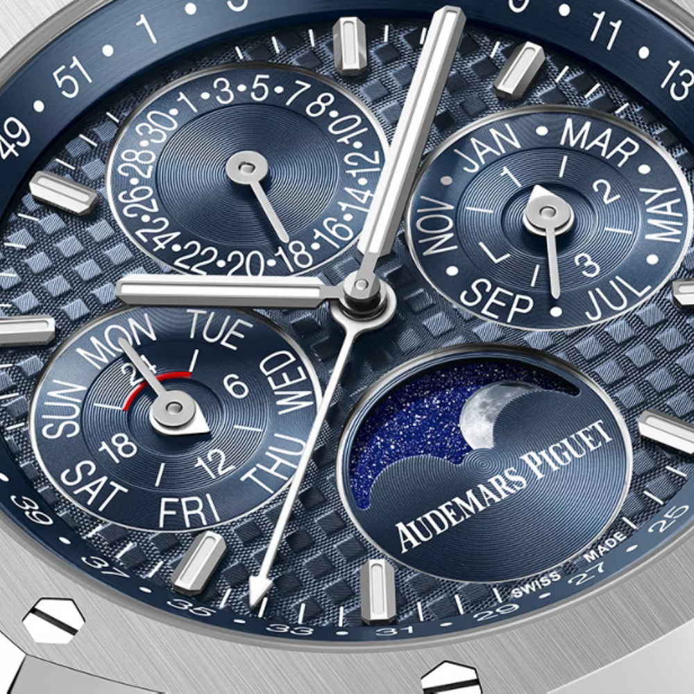 The Royal Oak Perpetual Calendar Ref. 26674ST.OO.1320ST.01 embodies the iconic sporty luxury style, featuring a robust 904L stainless steel case and bracelet finished with a refined mix of brushing and polishing. It stands out with the signature octagonal bezel and a blue dial with intricate patterns, creating a distinct visual identity. With a complex yet balanced layout displaying the perpetual calendar and moonphase, this model offers a look that is both strong and refined, suitable for gentlemen who appreciate technical class and difference.