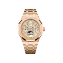 The Royal Oak Perpetual Calendar Rose Gold 26684OR.OO.1356OR.01 embodies the iconic sporty luxury style, featuring a robust 904L stainless steel case finished in a brilliant rose gold tone. It stands out with the signature octagonal bezel, uniquely detailed with refined cut artificial stones at the decorative screw positions. The champagne dial with intricate Guilloché engraving creates visual depth, while the balanced multi-subdial layout provides a look that is both mechanically complex and neatly organized.