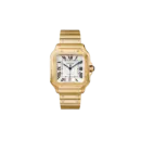 This Santos de Cartier expresses classic luxury with a refined sporty edge. The warm yellow-gold-toned case and bracelet contrast beautifully with the brown dial, creating a sense of authority and sophistication without excess. The Roman numerals, chemin-de-fer minute track, and signature blue sword hands add timeless character, making this watch ideal for those who appreciate iconic design and understated prestige.