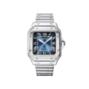 This model showcases a distinct modern elegant aesthetic with a captivating colorway. The bracelet is made of 904L stainless steel with a solid integrated link design, finished with brushed surfaces and polished edges, providing a seamless flow with the case. The bezel maintains the signature square shape with rounded corners and polished finish. The standout feature is the gradient blue dial, adorned with metallic silver Roman numerals and polished steel sword hands filled with luminescence, ensuring excellent legibility and a sharp, high-contrast look.