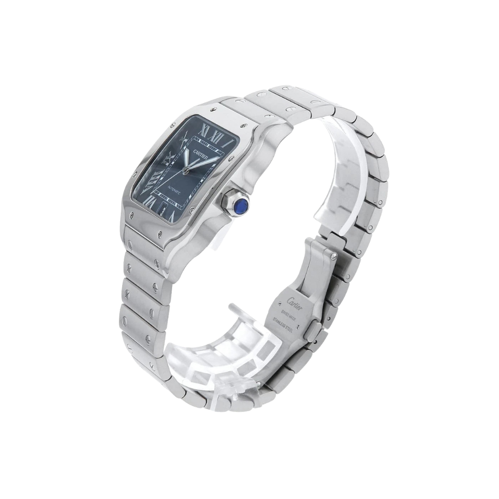 The Santos de Cartier Blue Dial Ref. WSSA0063 brings a deep, masculine allure to the iconic collection. This Large model features a mesmerizing gradient blue dial that transitions from a bright center to a deeper navy at the edges, creating a sophisticated play of light. Encased in robust 904L stainless steel with a matching integrated bracelet, it offers a modern, elegant, and confident look, perfectly suited for gentlemen who value both historical heritage and contemporary style.