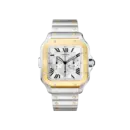 The Santos de Cartier XL Chronograph Steel/Gold Ref. CRW2SA0008 embodies a high-class sports style, showcasing a harmonious combination of 904L stainless steel and luxurious gold details. It features the signature rounded square bezel and an integrated bracelet accented with gold-tone screws, creating a look that is solid, masculine, and rich in technical imprint. The silver dial with a balanced 2-subdial chronograph layout and classic Roman numerals is suitable for modern businessmen who appreciate a calm yet flexible appearance for any context.