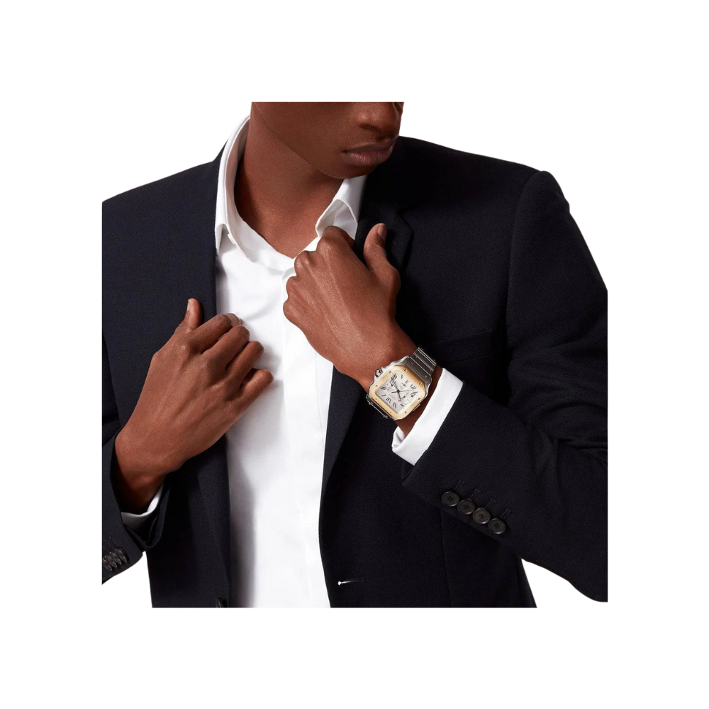 Inspired by the Santos line born in 1904, associated with the aviation pioneer Alberto Santos-Dumont, this model continues the spirit of innovation and sky conquest of the 20th century. The XL Chronograph Steel/Gold version reimagines that history through the iconic square design and the chronograph layout serving precise timing needs. It represents a modern breath of life, harmonizing into a symbol of confidence, accuracy, and a timeless style for those who always look forward.