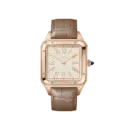 The Santos-Dumont watch Ref. WGSA0111 represents a blend of modern gentlemanly style and classic elegance. The design features the signature square case with rounded corners, crafted from 904L stainless steel and finished in a warm, luxurious gold tone. It pairs perfectly with a high-quality brown leather strap featuring a natural grain texture, creating a look that is soft yet masculine. The standout feature is the gold champagne dial with a sunburst finish and a minimalist design devoid of hour markers, complemented by slender gold baton hands, offering a balanced, aesthetic, and dignified appearance.