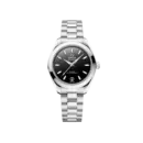 This model exhibits a sharp and timeless aesthetic. The 904L stainless steel strap is designed as a seamless integrated bracelet, providing a sturdy and comfortable feel on the wrist. The fixed bezel is a smooth round ring made of 904L stainless steel with a polished finish, enhancing the sleek profile. The black dial features a satin finish that adds texture and depth, while rounded baton hands and hour markers ensure clarity and maintain a clean, classic look.