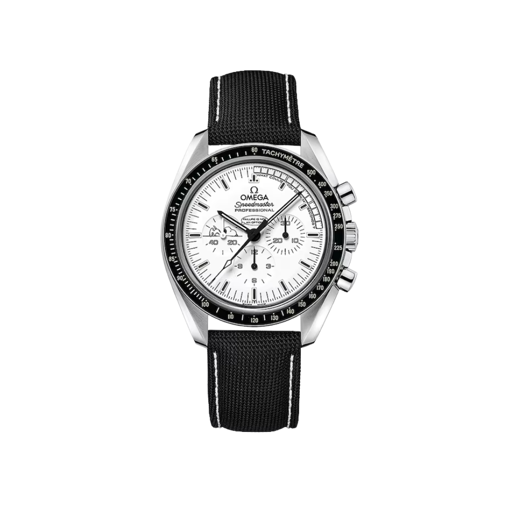 This model blends bold character with iconic vintage chronograph aesthetics. The white dial creates strong visual contrast with the black technical fabric strap, reinforcing a professional, tool-watch appearance. Sporty yet timeless, it is designed for those who admire the historic Speedmaster identity while seeking a youthful, dynamic, and confident expression of personal style.