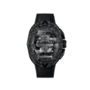 and markers, skeletonized dial, and pavé-set black synthetic stones create a mysterious,