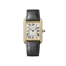 The Tank Louis Cartier watch Ref. WGTA0357 embodies classic French elegance, featuring a distinct rectangular case design characteristic of the Tank line. Crafted from 904L stainless steel and finished in a luxurious gold tone, it connects seamlessly to a high-quality dark grey leather strap, creating a look of refined, exquisite beauty. The silver dial, adorned with black Roman numerals and characteristic blue steel sword-shaped hands, creates a balanced, artistic, and symbolic appearance suitable for those who appreciate a sophisticated, minimalist, yet classy lifestyle.