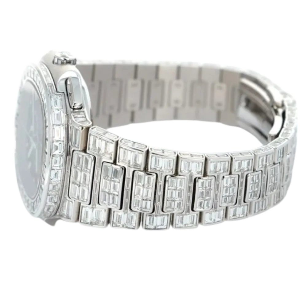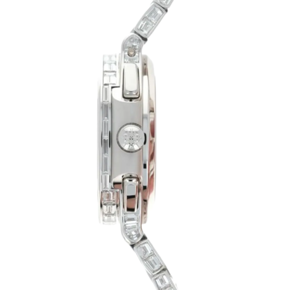 Inspired by the Nautilus line born in 1976—a symbol that changed the world’s view of high-end sports watches with a design taken from ship portholes—the Ref. 5990/1400G-001 fully inherits that historical spirit. It develops in a more modern direction where stone-set details are arranged delicately around the bezel, complementing the balanced chronograph function. The integrated steel strap honors the luxurious metallic shine while maintaining the inherent robustness, evoking the Nautilus DNA throughout decades. This creates a timepiece that is not just a tool for time but a statement of aesthetic taste, history, and the owner’s class.